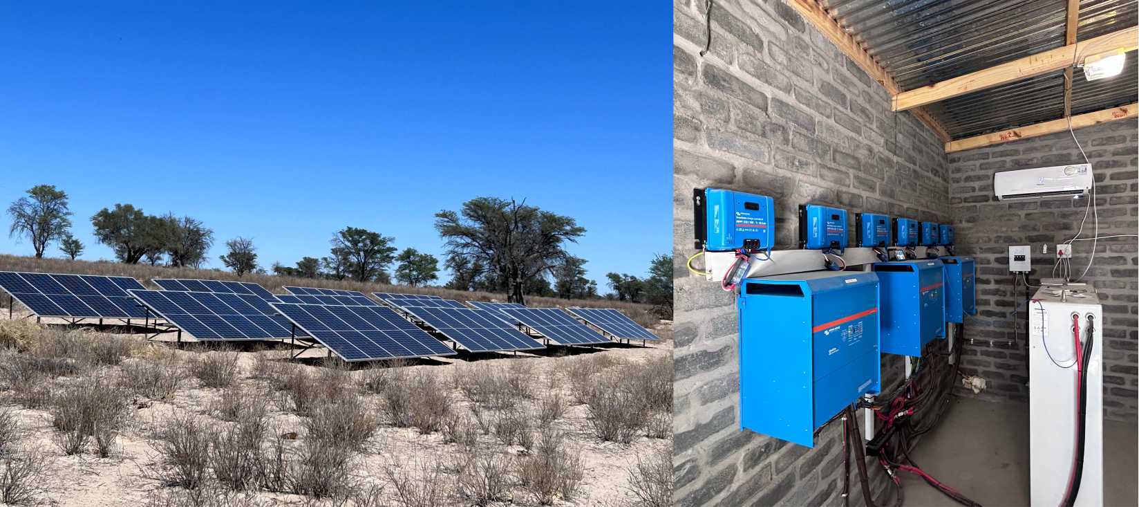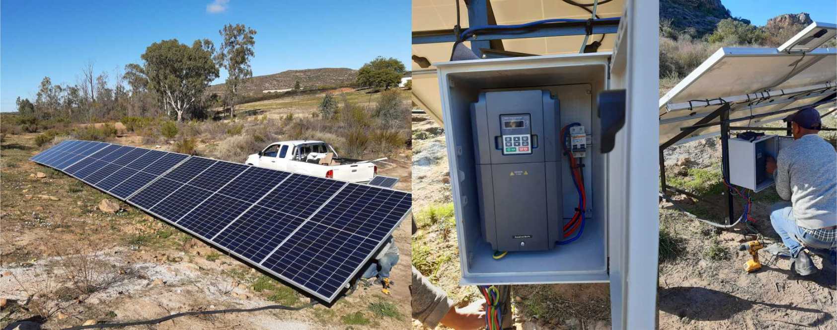 V16 x 455 Watt Canadian solar panels with a 5,5 kWatt 3 Phase DC/AC pump inverter running a 5,5 kWatt bore hole pump.